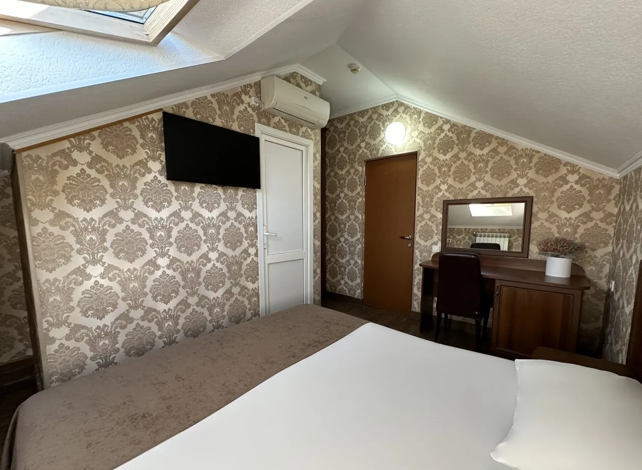 | Стандарт Стандарт 2-местный на мансарде | 14 кв.м. | 2 чел. | Мебель (вешалка, зеркало, кровать двуспальная, прикроватные тумбочки, стол, стулья, шкаф), Оборудова... | |